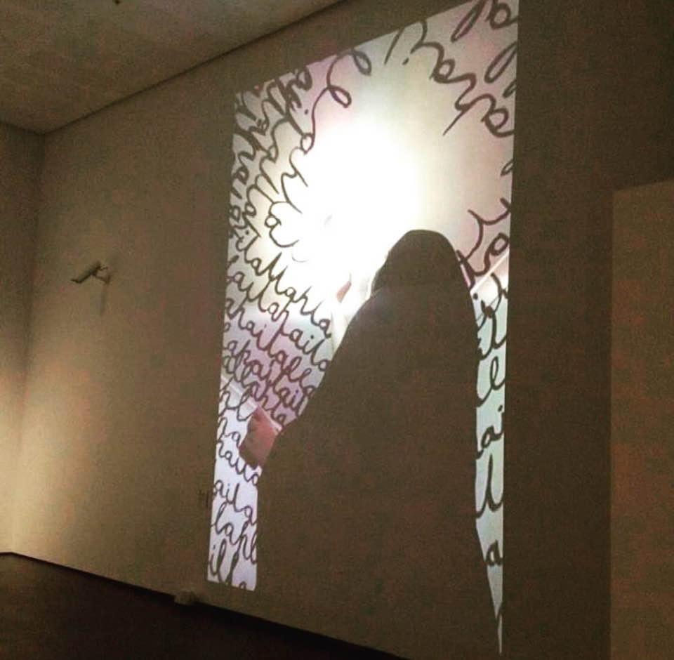 Gallery view of ‘The untorn fabric of what is stirred’ and ‘There is no reality but the Reality’ showing the huge scale of the work when loop projected onto the gallery wall.